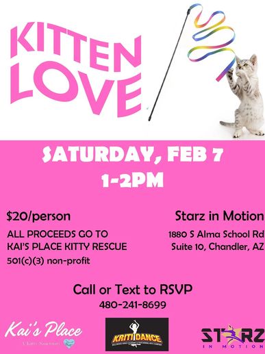 Play with cats/kittens from a local rescue organization. Class includes gentle yoga, ribbons, wands and balls as you play with cats/kittens. Open to all.