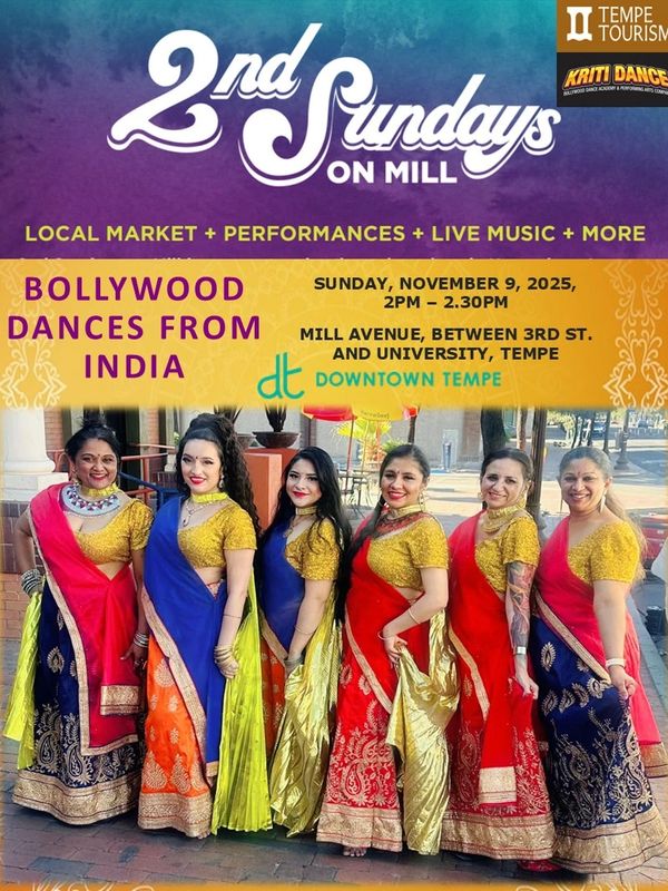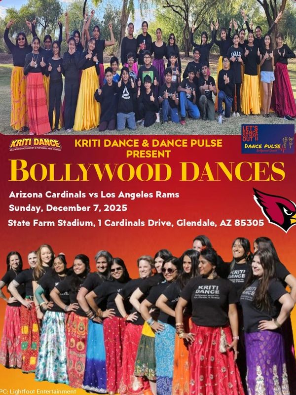 🎉 Come watch Bollywood dances from students of Kriti Dance and Dance Pulse at the NFL game of AZ Cardinals vs LA Rams. The outdoor tailgate performance features a variety of dances and music by students showcasing the rich culture from India🧡