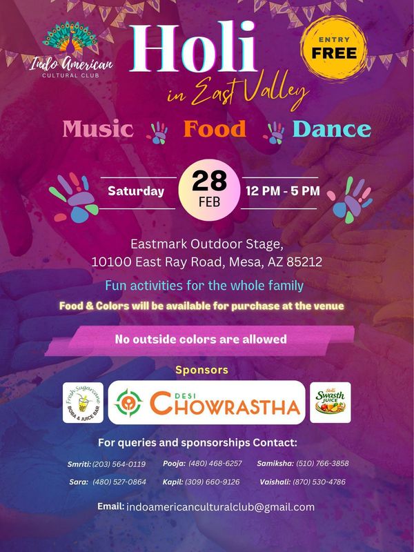 Come experience the Color Festival from India, play with different powder colors, eat Indian food, and watch live Bollywood dances showcasing the rich culture from India. Free, fun, family-friendly event, open to all.